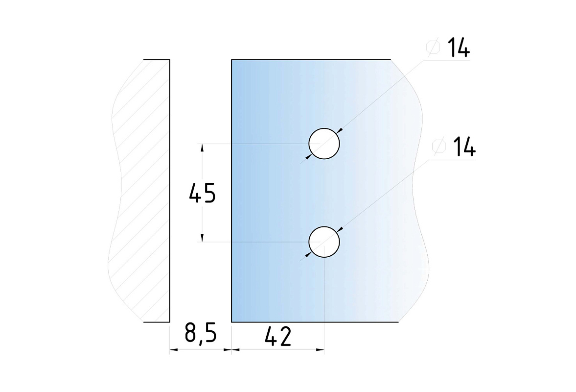 Стекло с готовым вырезом 14 мм, фиксируется с помощью саморезов или винтов со шляпками, закручивая используется уплотнитель. Также, если между стена-стекло остаётся щель, то используем уплотнитель.