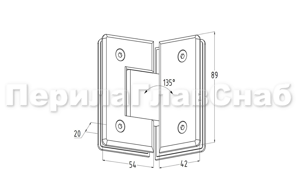 Петля из цинка предназначена для стыковки между собой конструкционных элементов из стекла, толщина которых находится в диапазоне от 8 до 10 мм. Максимальный вес двери на 2 петли составляет 35 кг. Этот вид петель подразделяется по типоразмеру на правый и левый. В конструкции заложена система скрытого крепежа. Имеет функцию доводчика до закрытия от 25°. Максимальный угол разведения стыковочных элементов в плане составляет 135°.
