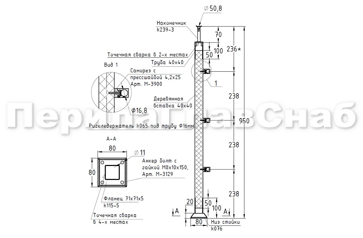 Готовые стойки – это экономия вашего времени и денег. Приобретая готовую стойку Вы можете собрать ограждение сами, не привлекая монтажную бригаду и экономя денежные средства на монтаже. Стойка легко монтируется к полу благодаря четыреханкернуму фланцу с отверстиями под анкер-болт М8 ( , , ) или шпильку ( ; ) в комплекте с хим анкером или , а крепеж скрывает декоративная крышка идущая в комплекте стойки. Поручень из нержавеющей стали можно закрепить при помощи самореза (, , ), либо при помощи заклепки () и винта М6 (М-3973) что на порядок эффективней, для крепления при помощи заклепок необходимо растачивать отверстие в ложементе. Если вы используете деревянный поручень, то его можно закрепить при помощи саморезов ( , , ). После покраски дубовой проставки подклеиваете клеем ( , ). Ограждение готово!