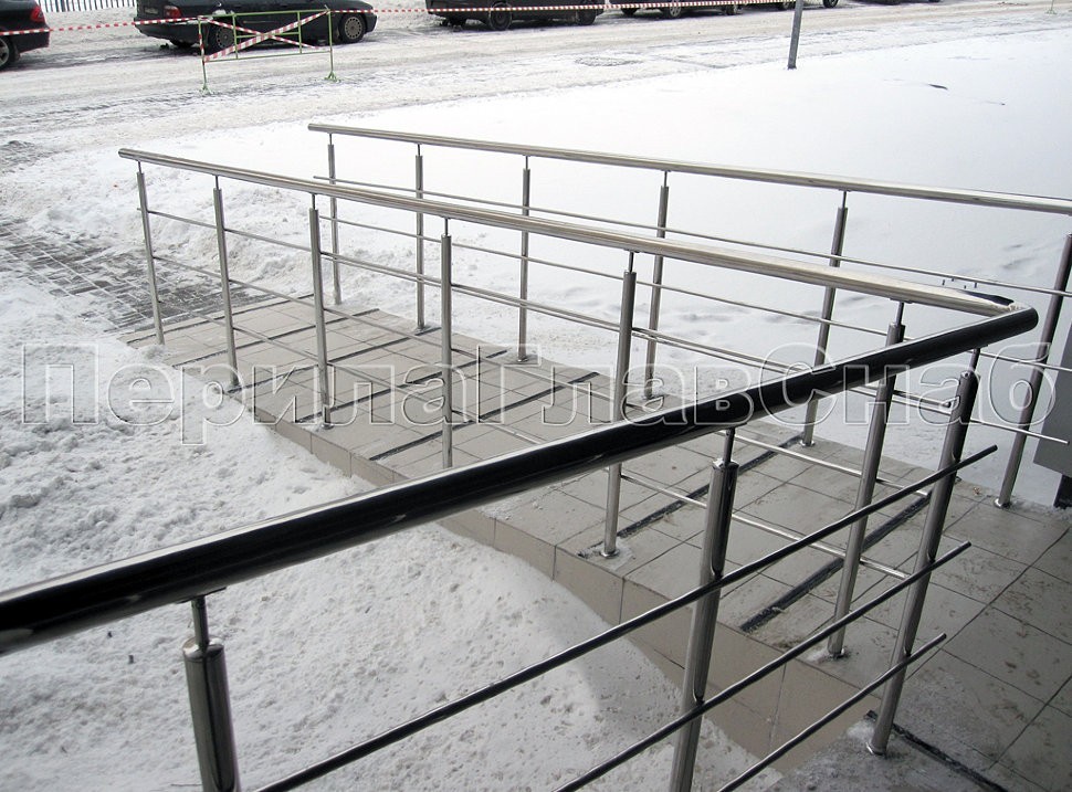 На вершине каждой стойки ограждения между перилами из нержавейки и вертикальными трубками были установлены наконечники типа «штырь», как бы «приподнимающими» поручень над металлоконструкцией.