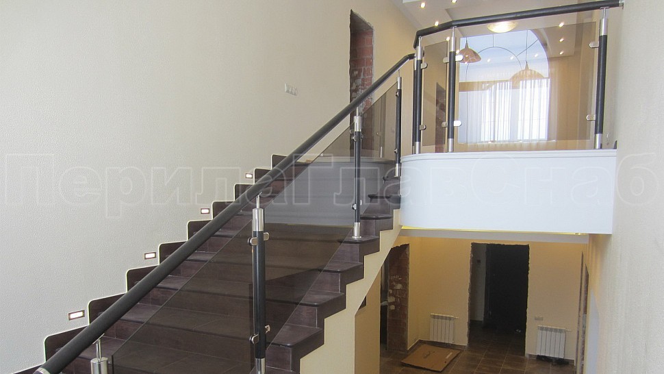 В загородный дом, было установлено лестничное ограждения высотой 950 мм с бронзовым каленым стеклом толщеной 8 мм, с деревянным поручнем диаметром 50 мм, стойки диаметром 50 мм из полированной нержавеющей стали с деревянными вставками устанавливаются через две ступени на третью. Верх стойки штырь, низ стойки декоративная крышка. Окончание поручня заглушка. Поручень завязан, свариваемые швы шлифуются и полируются до блеска. Наши лестницы и ограждения всегда найдут место в вашем доме. Впишутся в любой интерьер. Московская область, Солнечногорский район, д.Якиманское