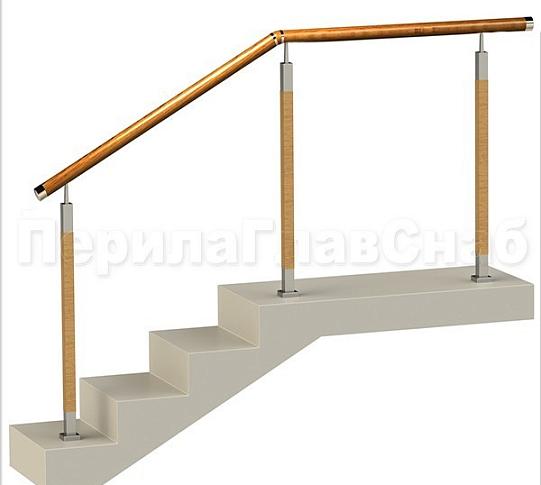 - Нержавеющие ограждения без ригелей с круглым деревянным поручнем и стойками с деревянными вставками