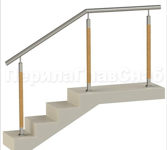- Нержавеющие ограждения без ригелей с круглым поручнем и стойками с деревянными вставками