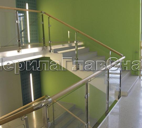 - Ограждение с деревянным поручнем, стеклом и стойками